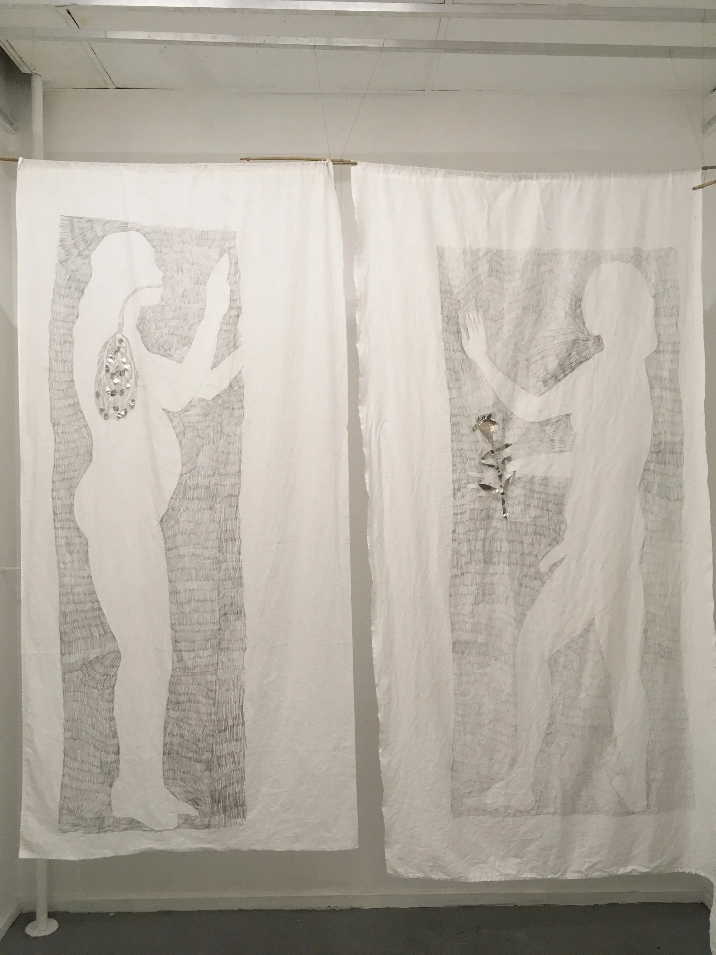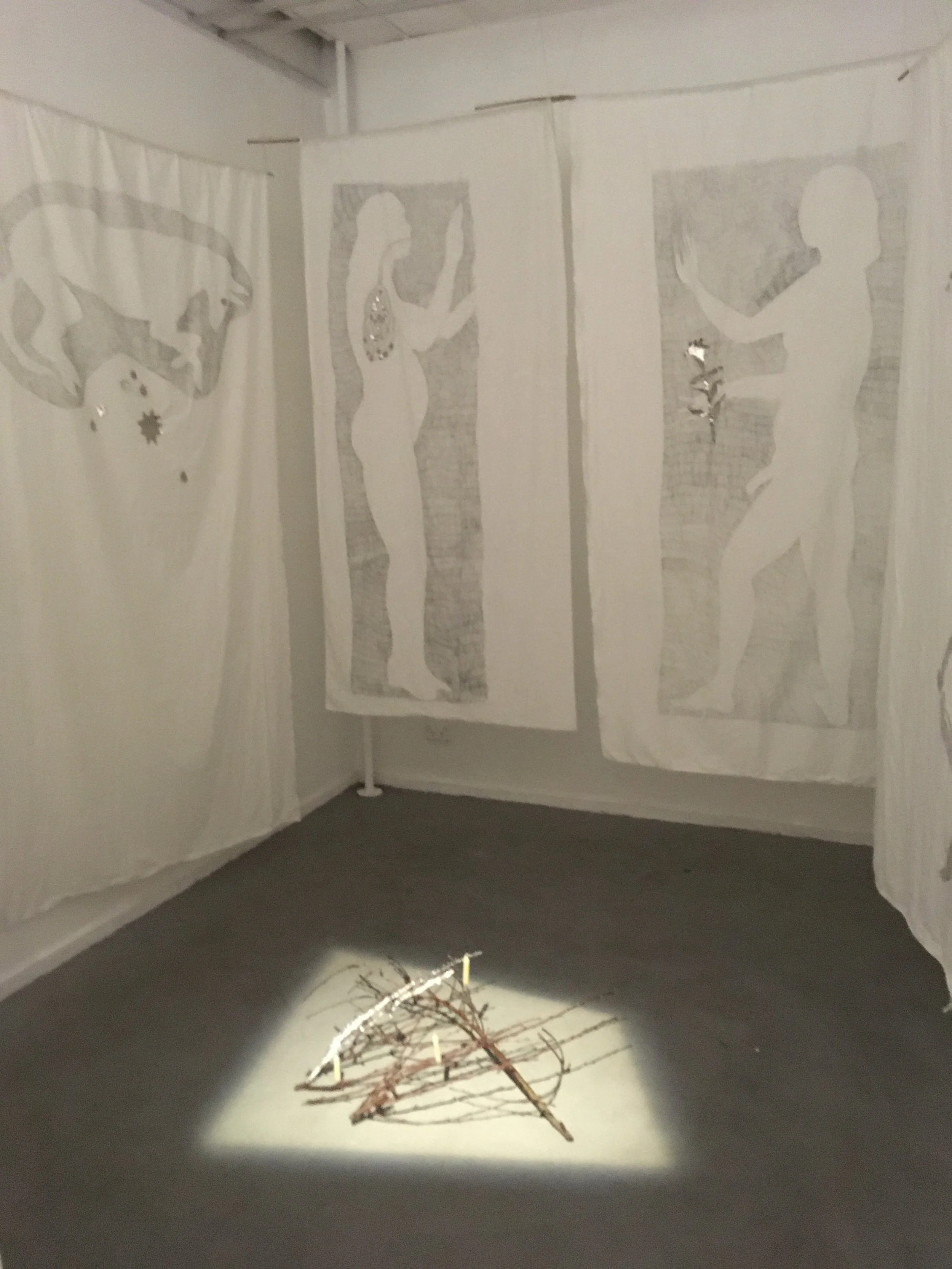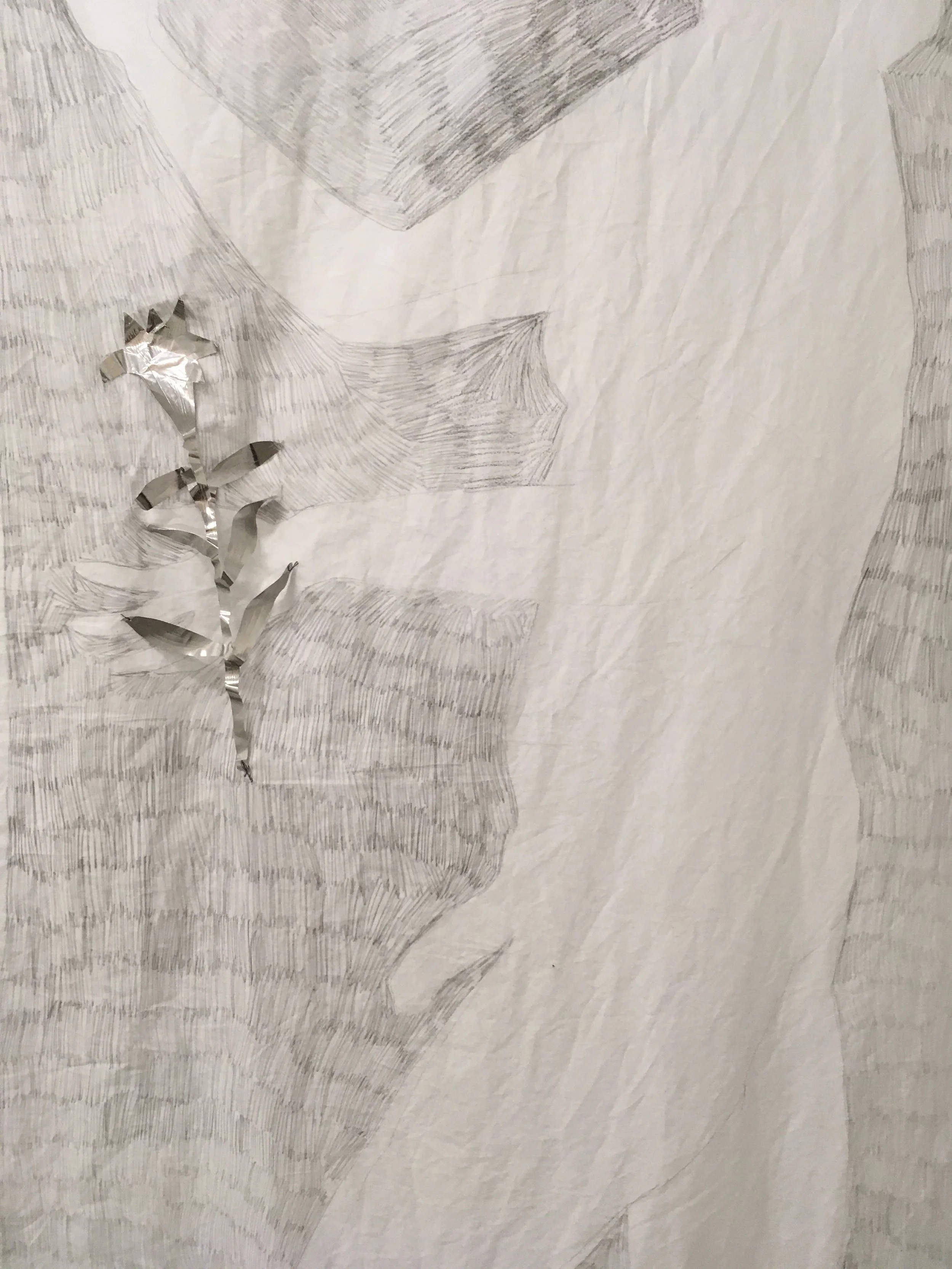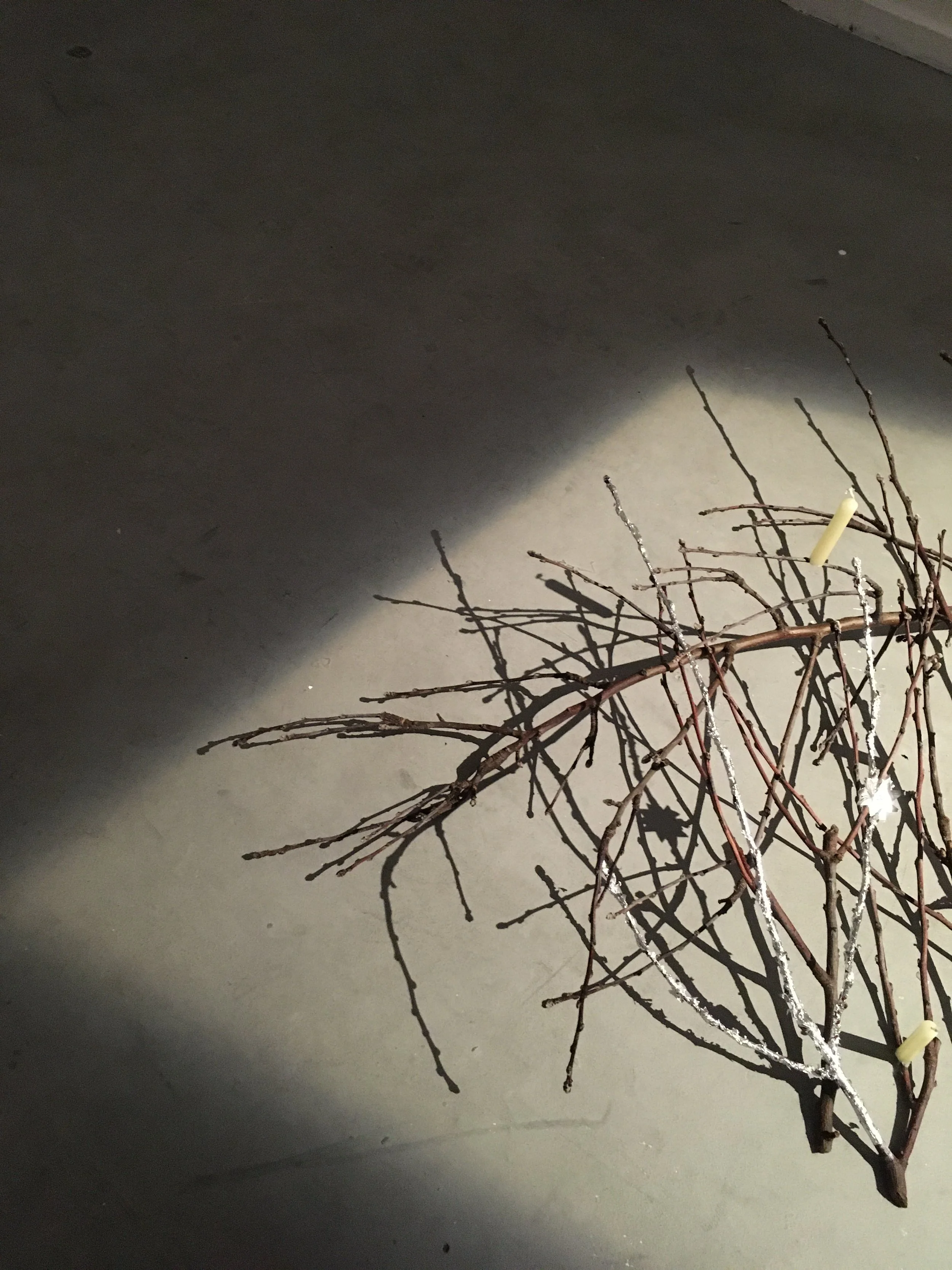 Graphite and aluminium on cotton sheets. Bamboo, cotton, apricot branches, candles.