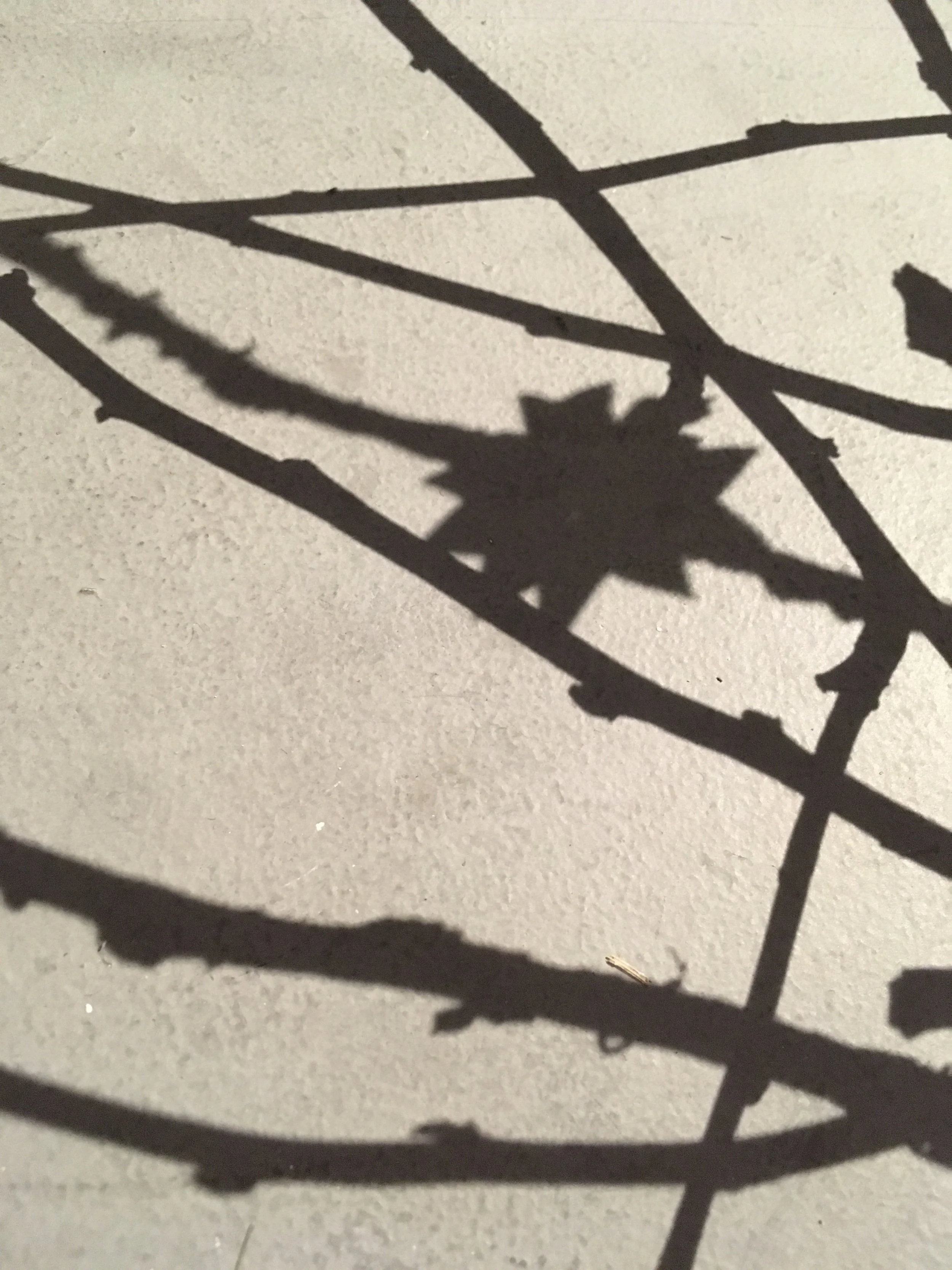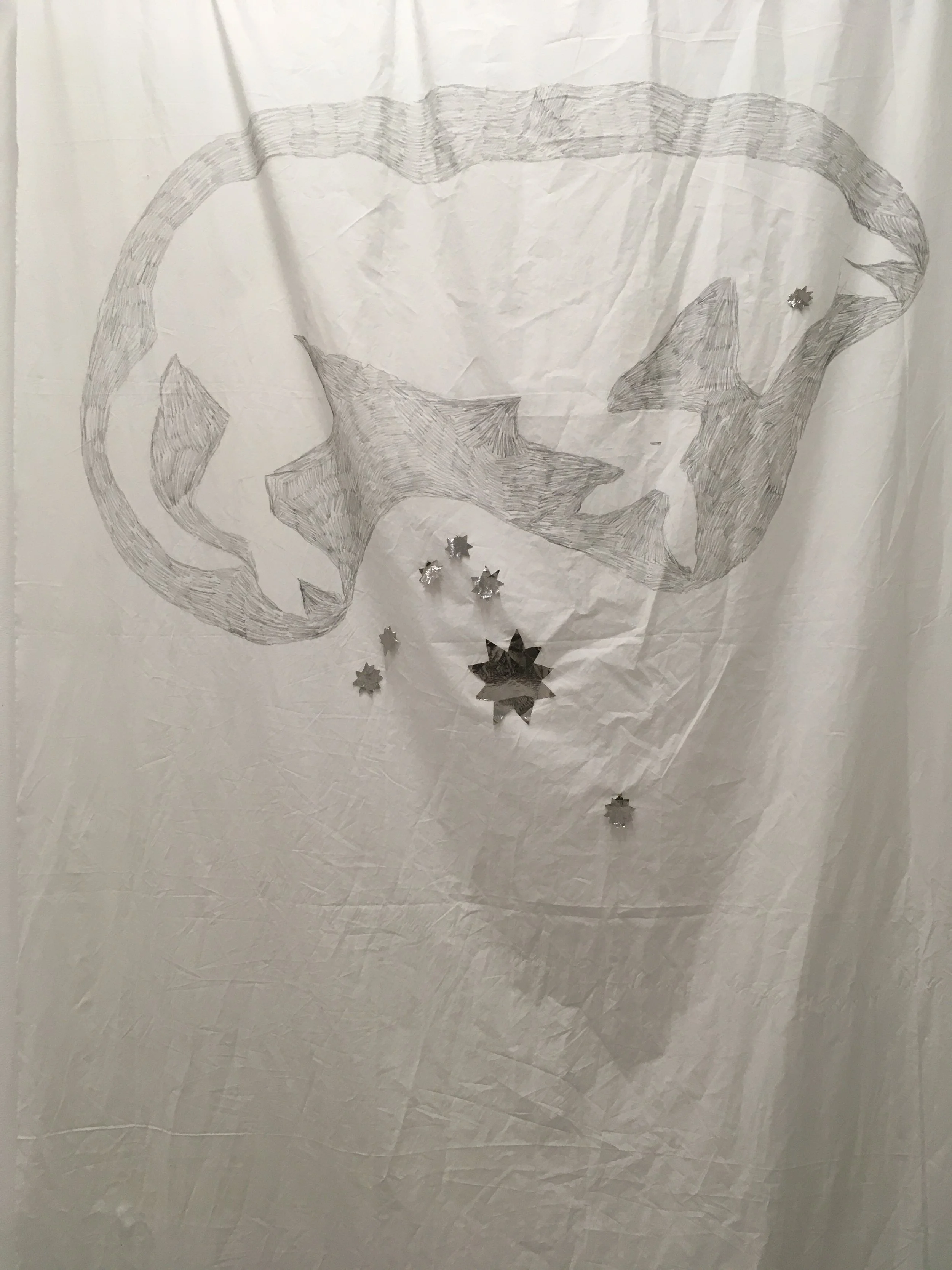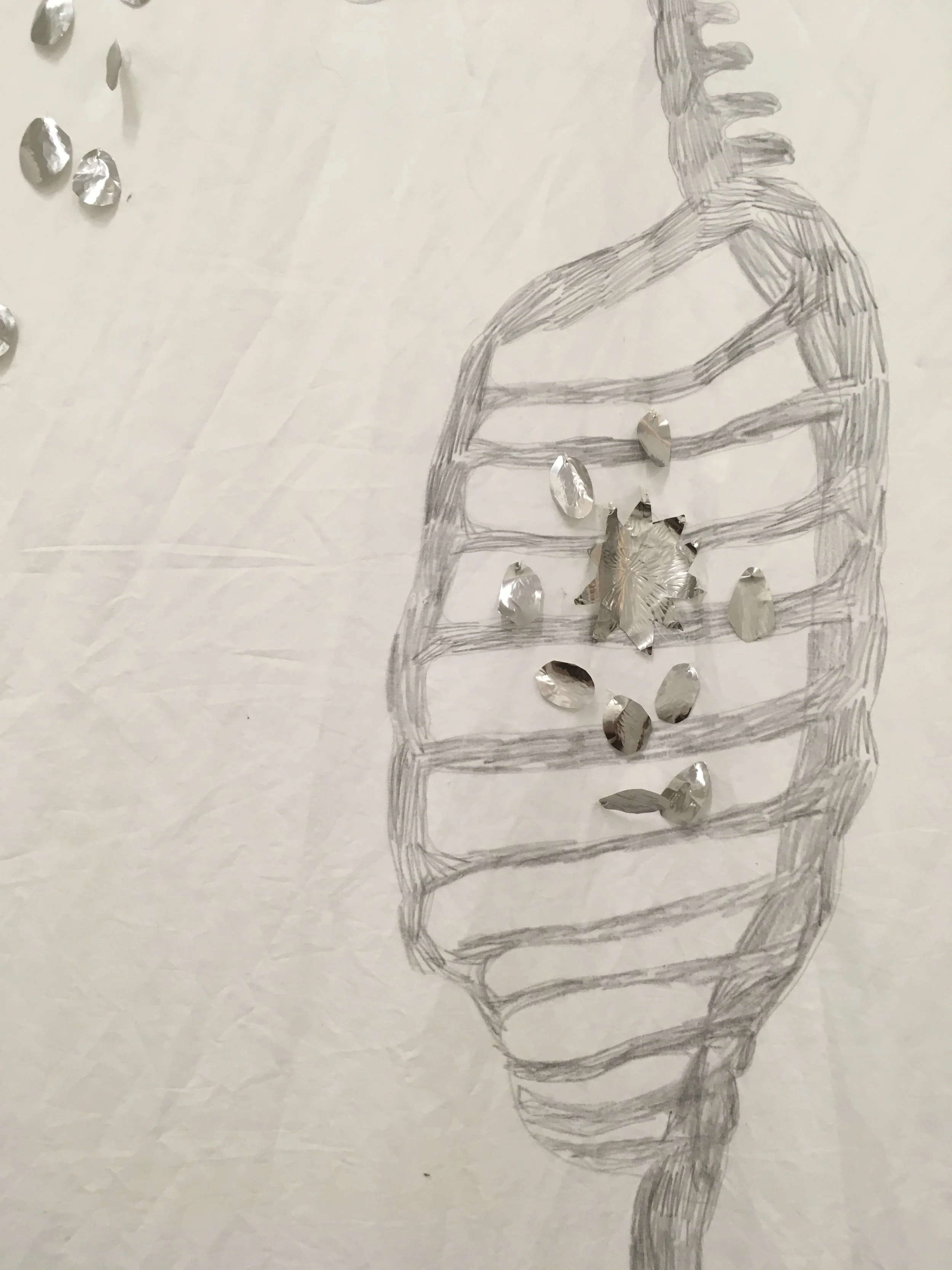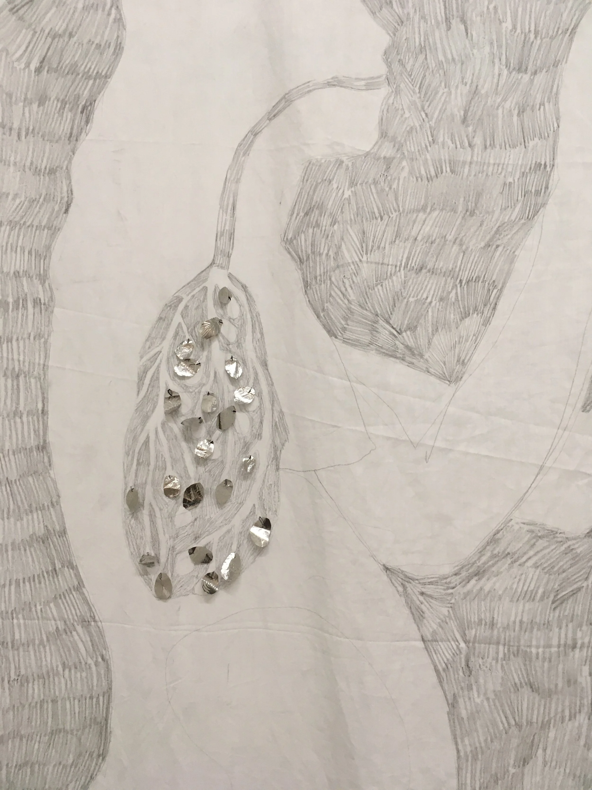 Graphite and aluminium on cotton sheets. Bamboo, cotton, apricot branches, candles.