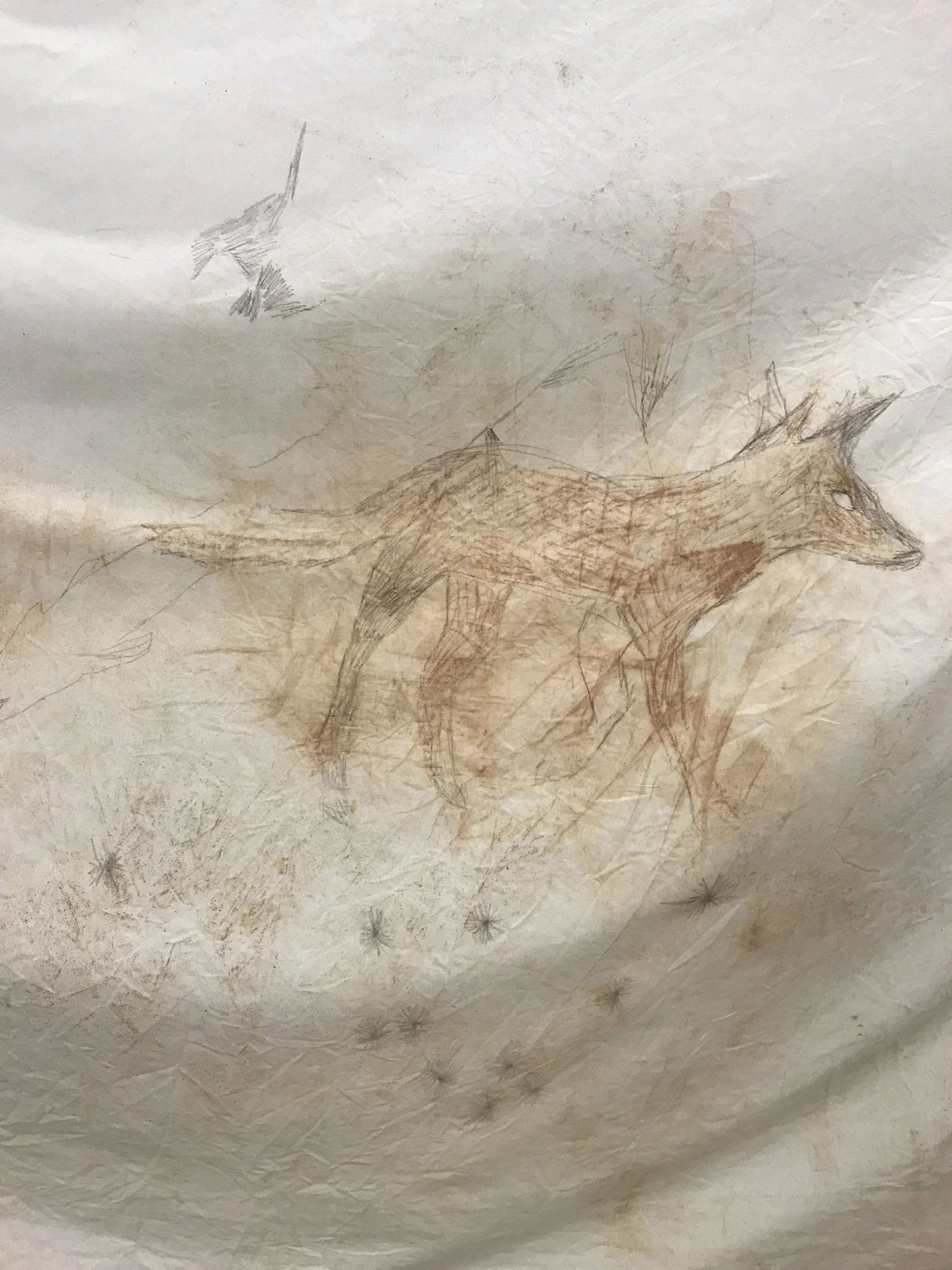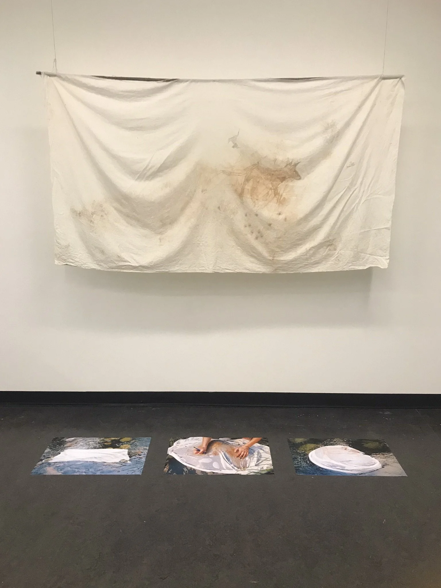 Original drawings made in the Howqua River, Taungurung Country with graphite, earth pigment and river water on cotton. Hung here as part of an installation work Sleeping Dogs, 2022, a piece looking at the figure of the wild dog in relation to Australian colonial identity and relationship to place